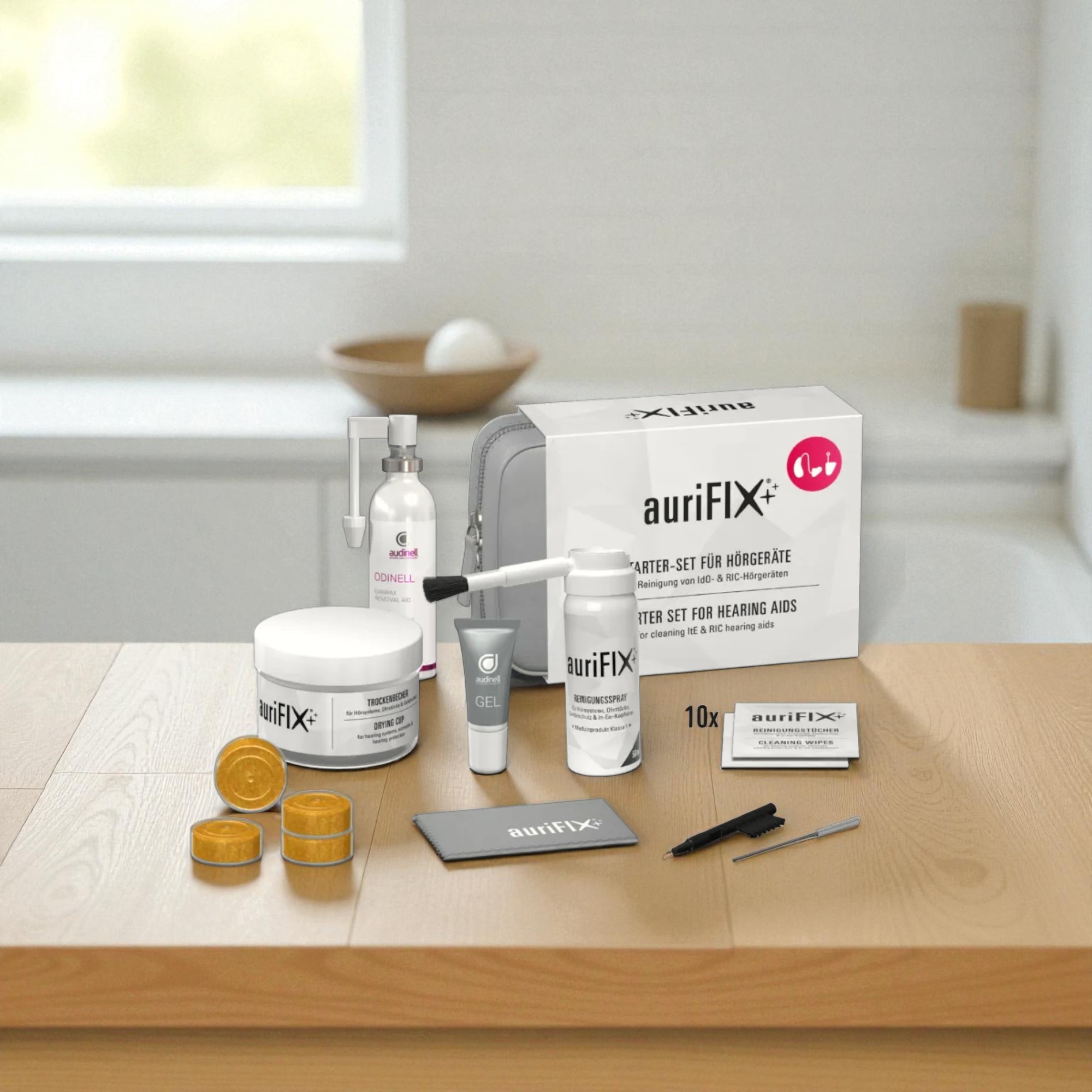 Das Hörluchs auriFIX Starterset für IdO- & RIC-Hörgeräte ist perfekt für alle, die täglich Hörgeräte tragen und Wert auf Hygiene, Komfort und Zuverlässigkeit legen.