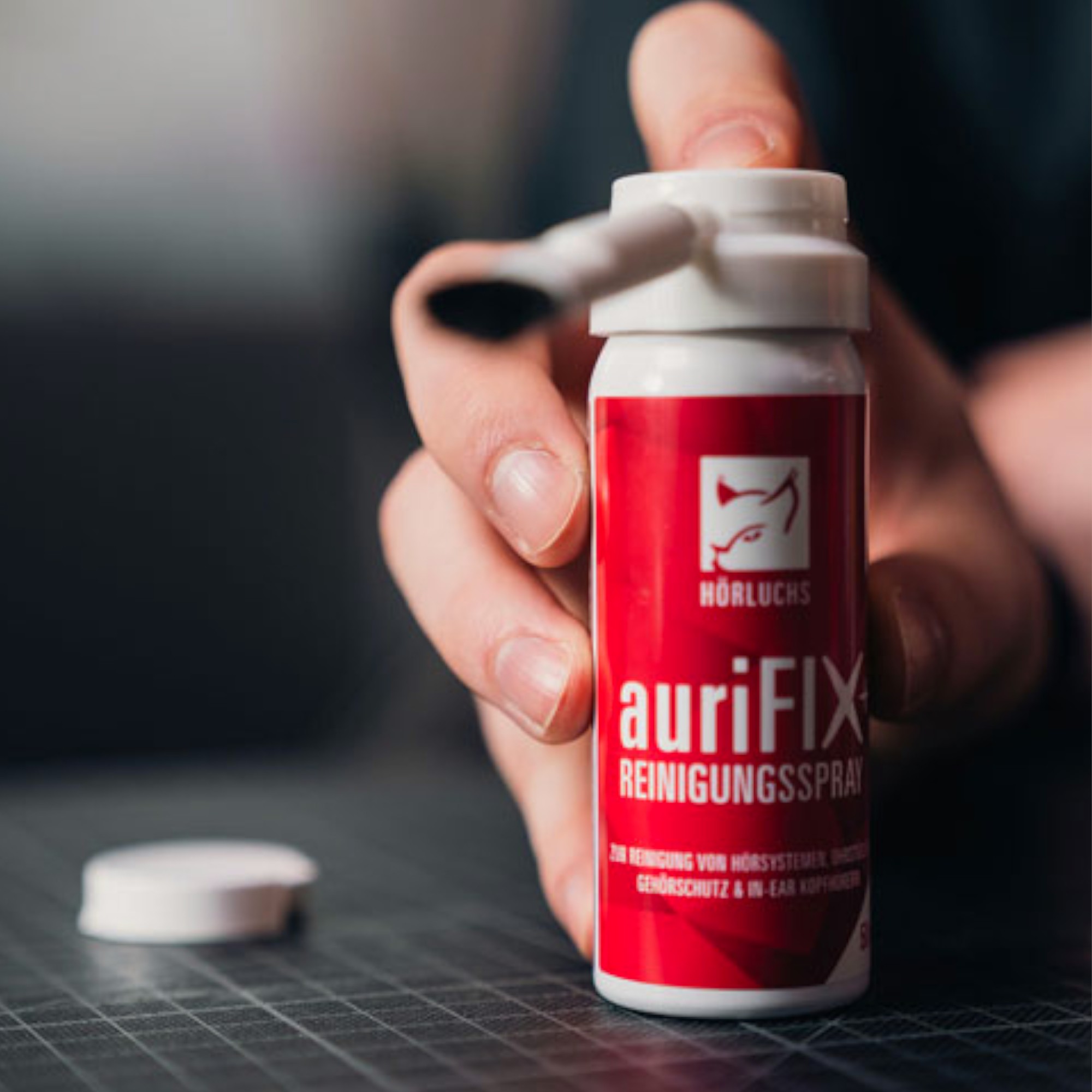 Das Hörluchs auriFIX Reinigungsspray wurde speziell für die sichere und effektive Reinigung von Hörgeräten, Gehörschützern (Otoplastiken) und In-Ear-Monitoren entwickelt.