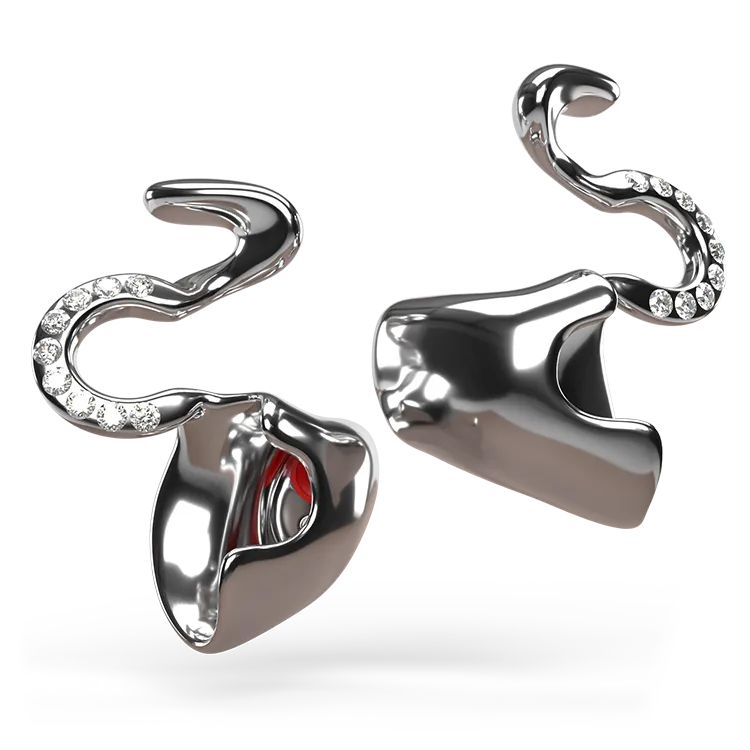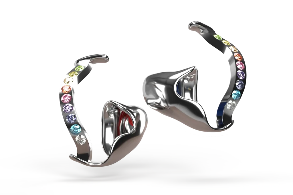 De titanium basis wordt zorgvuldig gevormd voor een perfecte pasvorm, helemaal op maat voor jouw oor. Daarna wordt het oppervlak bewerkt tot een subtiel glanzende finish, met kleine ingelegde steentjes in verschillende tinten.